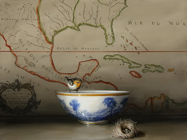 I paint refuges, places to go to for solace. I want my paintings to be destinations of quiet and calm. However, this world is fragile. The elements in the foregrounds of my paintings are items carefully constructed, either by humans or animals. Yet, they are objects easily broken or destroyed. Birds represent messengers from the wild. They embody beauty and fragility. They are visitors that remind us of lands beyond, wilderness. The distant landscapes in my paintings are remembrances of the natural past, vaguely familiar and pleasing.